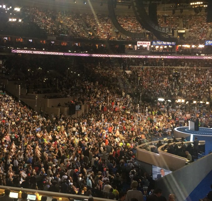 A concentration of @BernieSanders supporters in the California delegation. Shirts: "Enough is enough" #DemsInPhilly